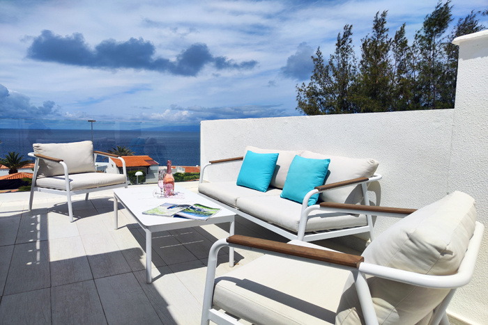 Im Dachgeschoss findet man eine beeindruckende Terrasse mit atemberaubendem Blick auf den Atlantik und die Berge. Gemütliche Chill-out Möbeln laden zum Verweilen ein.